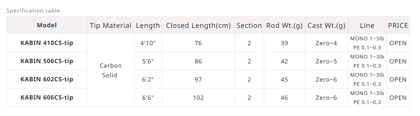 KABIN", hassasiyet, atış ve kullanım kolaylığı arayışında, gereksiz fazlalıkları bir şekilde ortadan kaldırarak aşırı hassasiyetle üretilmiştir. Sadece net vuruşlar değil, aynı zamanda hafif dokunuşlar, kaymalar gibi su altındaki tüm hareketleri size iletir. KABIN varyasyonları, tüm ajing modellerinde en yüksek "hissetme" ve "yemleme" seviyesine ulaşan tek üründür. Uç kısmı, her biri kendine özgü özelliklere sahip karbon tubular, karbon solid ve titanyum malzemelerden yapılmış 3 harklı uç seçeneğine sahip, yüksek hassasiyet ve performansını bozmadan elinize iletir.